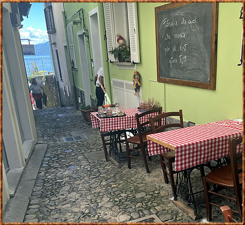 Once we docked at the Bellagio we had about an hour and a half on our own, primarily to find a spot for lunch. We quickly picked a spot with a line, but if we could get it, we thought it would be an ideal spot for our lunch. We spent a good 45 minutes in line (and there were only about ten people ahead of us, but it was RIGHT on the water. We were with a couple we'd met on our day sailing through Elphati Islands in Croatia, Bill and Linda from San Diego. Linda is a retired school teacher and Bill a retired HS principal, so you can see why we connected so easily. But here's the story that made our relationship blossom so quickly..... So back track to the day we got off the ship. We first had a mix-up about the busses and had to re-line up with luggage to get organized correctly and then when our guide Stephania counted us we were two short. Looked it up and she called out, "the Foxes?" No reply. She checked with the Viking people - apparently a "no show." We begin to pull away and one of the security guards chases us down - oh, we think, the Foxes are late arrivals. Nope. Apparently they did not show. So we proceed with the trip to Lake Maggiore. The next morning, yesterday, I'm looking over the breakfast buffet and Bill is there, says "Good morning Coach!" and when I sit down I said to Kim, "did you see Bill and Linda on the bus yesterday?" And she replied, "What if THEY are the Foxes!" So we went over to their table. Linda looks like she's been in a heavy weight boxing match and her right hand is all bandaged up. The day we were in Slovenia she fell in the hall way, took a nasty hit on the side of her head so that her eye was nearly swollen shut and was all bruised. And somehow her hand was sliced open. The Viking medical staff were not prepared for this kind of stitching in a key joint area and so Viking took her to the hospital. Of course the ship left for Venice and Viking put Bill & Linda up in a bed and breakfast. Got them back to the hospital for more testing and finally released her. Then Viking arranged to take them by personal car from Venice to catch up with us in Lake Maggiore! They arrived at midnight and here they were. This might have been the end of the story but in the lobby we shared this story with Stephania and she had no idea that the Foxes had arrived. And when she met them immediately began to look after Linda - as did Kim and I. And when we returned to the hotel at the end of yesterday's adventure, Stephania walked fifteen minutes the wrong way to a pharmacy to buy bandages and medical ointment for Linda's hand. When she got to the lobby we were with them and she and Kim re-bandaged her up! SOOOO....fast forward to today, we hooked up with them for lunch (and the farewell dinner tonight) and had our photo taken and our waterfront restaurant!